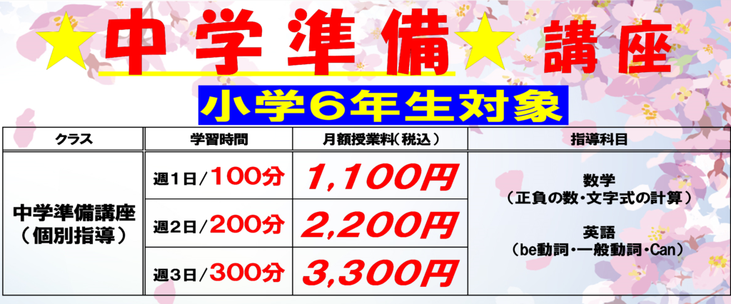 R5中学準備講座 2023年12月1日 最終更新日時 : 2024年4月10日 第一スクールベクトルワン 菊池、玉名の小学6年生の皆様、 保護者の皆様! とっておきの耳より情報です! 当塾では中学校でのスタートダッシュを目的として 「中学準備講座」を開講いたします。 急激に難易度が上がる中学校の勉強、不安ですよね。 不安を消す方法、それは早めに動いてしまうこと。 中学校のカリキュラムを知り尽くした講師陣が あなたのスタートを徹底サポート! 受講をご希望の方はホームページからお問い合わせ、 もしくは各校舎へお電話にてお問い合わせください。 お問い合わせこちらからお気軽にお問い合わせください。お急ぎの場合はお電話にてお願いいたします。FacebookXBlueskyCopy